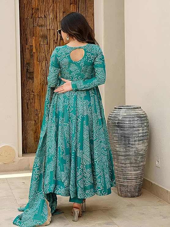 - Traditional Bandhani Print : All-Over Bandhani Pattern on a Rich Teal Green Base for a Vibrant Ethnic Look